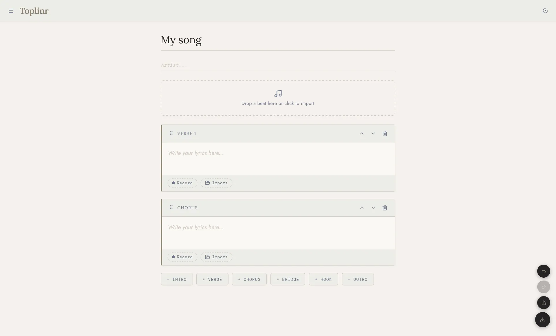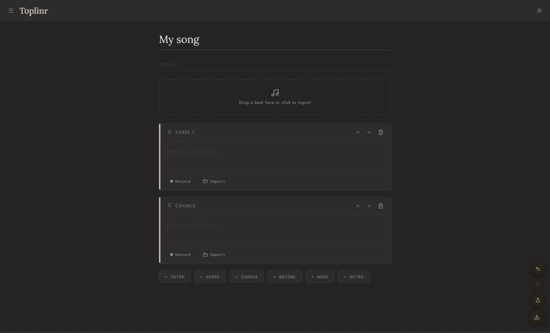 - Structured sections (Verse, Chorus, Bridge, Hook...) with drag & drop